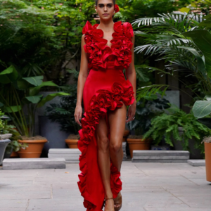 Frilled V Neck Red One Piece Swimsuit and Skirt Flaxmaker