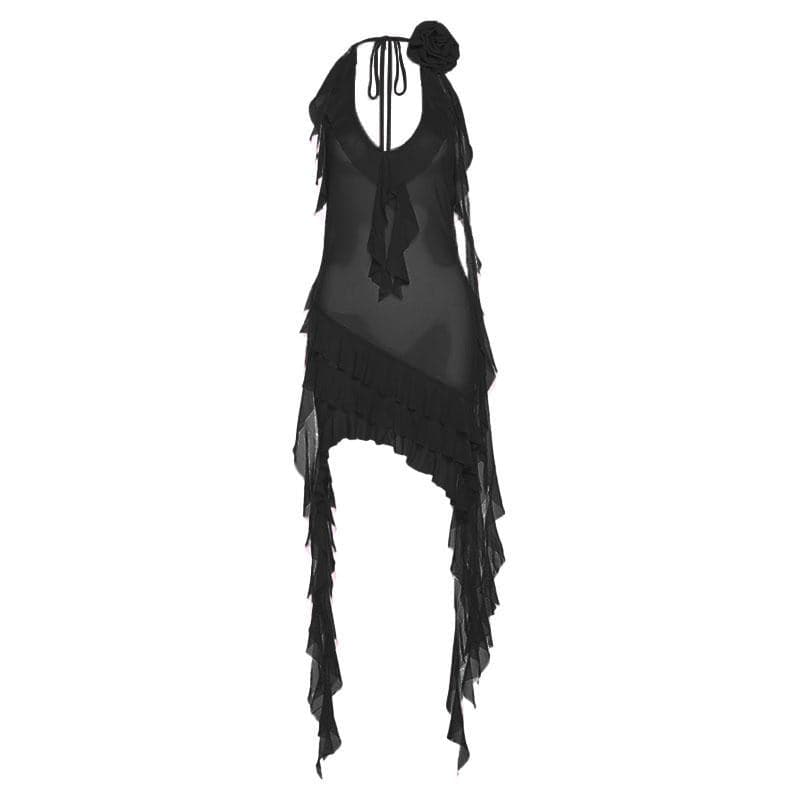 See through halter sheer mesh ruffle flower applique mini dress