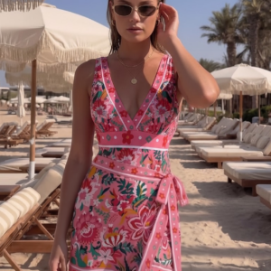 Pink Floral Paradise Print V-neck One Piece Swimsuit and Skirt