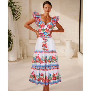 V Neck Ruffle Shoulder Embroidery Pattern Printed One Piece Swimsuit and Skirt Flaxmaker