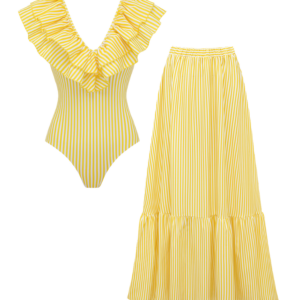 V Neck Ruffle Striped Print One Piece Swimsuit and Skirt