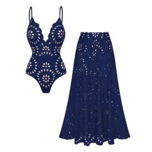 Navy Blue Laser Cutting Flower Hollow One Piece Swimsuit and Skirt
