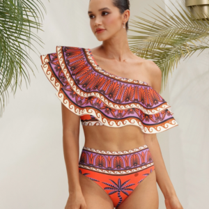 One Shoulder Ruffle Printed Bikini Swimsuit and Skirt Flaxmaker