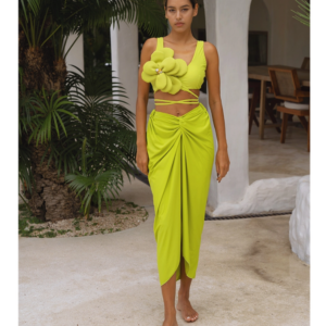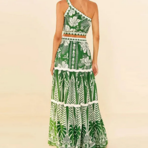 One Shoulder Green Flower Printed Bikini Swimsuit and Skirt