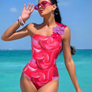 One Shoulder 3D Flower Decor Printed One Piece Swimsuit and Skirt