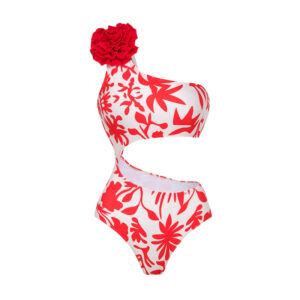 One Shoulder 3D Flower Cut Out Printed One Piece Swimsuit and Skirt
