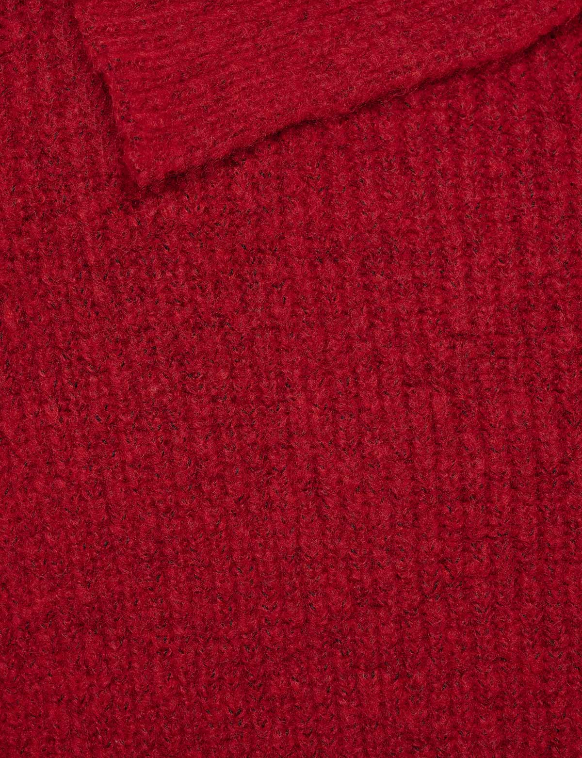 Asymmetric off the shoulder cherry red sweater with oversized sleeves .