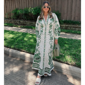 V Neck Retro Printed In Green Dress