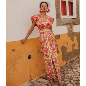 V Neck Retro Printed Slit Dress