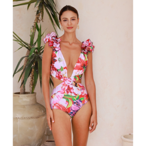 Ruffle Cut Out Floral Printed One Piece Swimsuit and Skirt