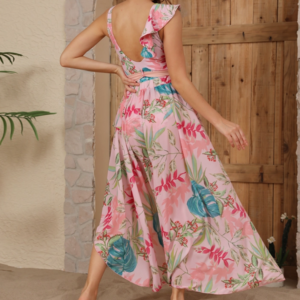 Pink Floral Paradise Print V-neck One Piece Swimsuit and Skirt