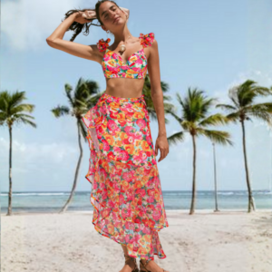 Ruffled Straps Floral Print Bikini Swimsuit and Skirt Flaxmaker