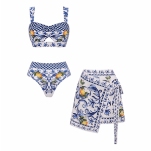 Lemon Print Ruffle Strap Bikini Swimsuit and Mesh Splicing Sarong Flaxmaker