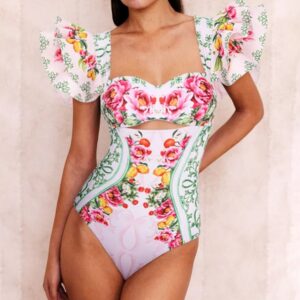 Ruffle Cut Out Lemon Floral Pattern Print One Piece Swimsuit and Skirt