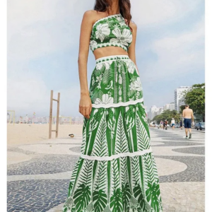 One Shoulder Green Flower Printed Bikini Swimsuit and Skirt