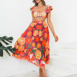 Printed Ruffled Starp High Waist Bikini Swimsuit and Skirt Flaxmaker