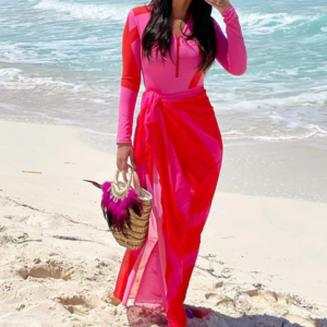 Color Block Long Sleeve Zip Front One Piece Swimsuit and Sarong