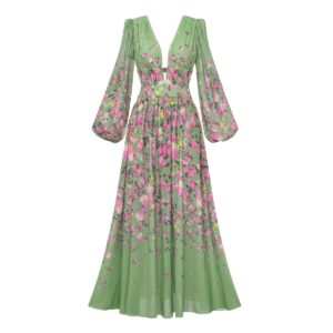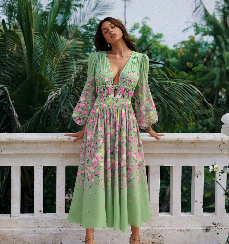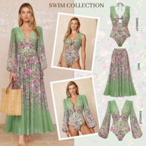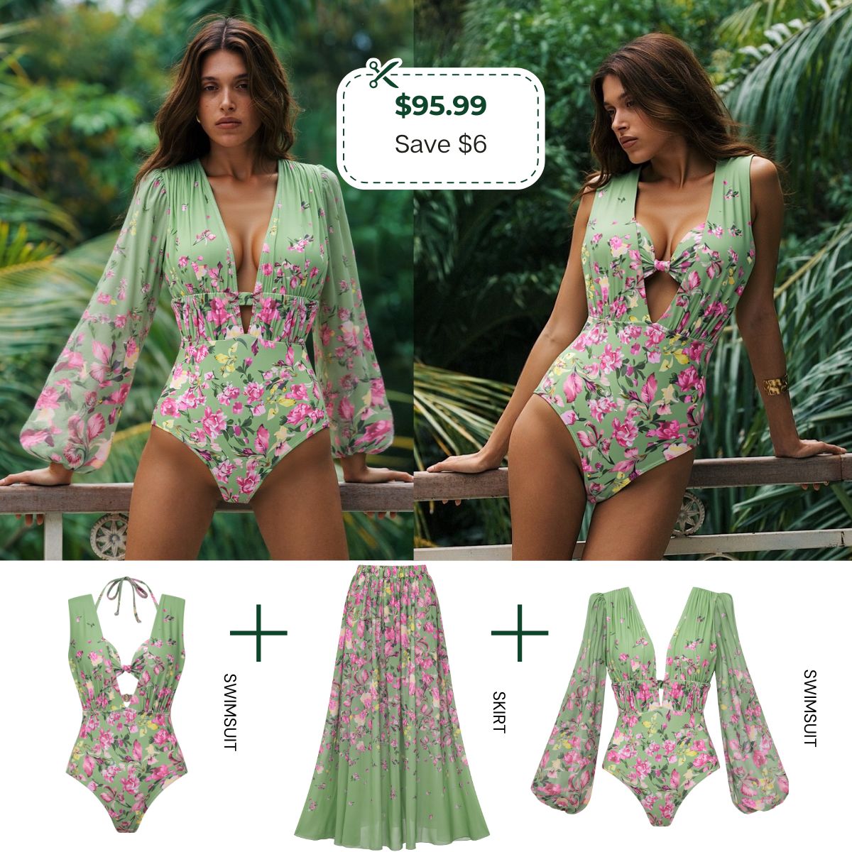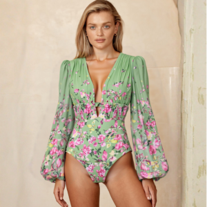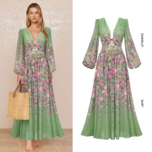 Long Sleeve Floral One Piece Swimsuit and Skirt