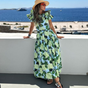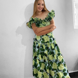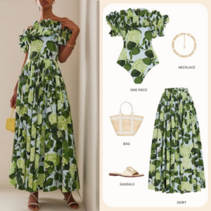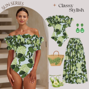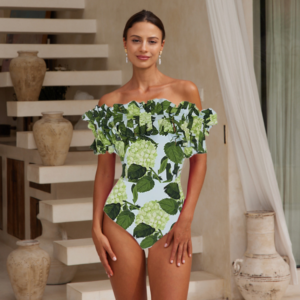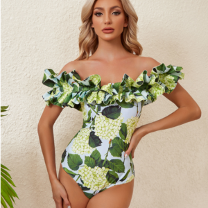 Off Shoulder Hydrangea Print Ruffle One Piece Swimsuit and Skirt Flaxmaker