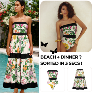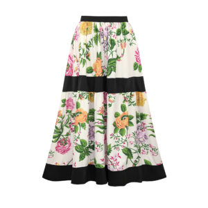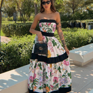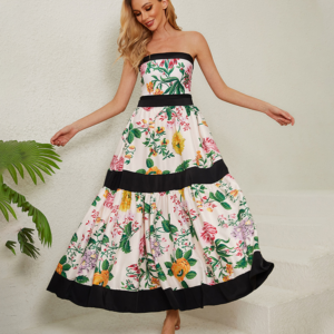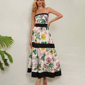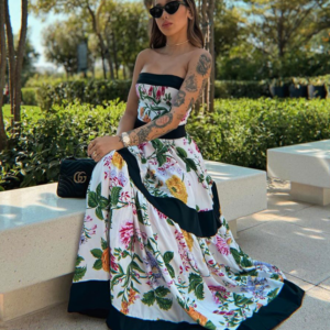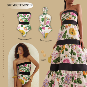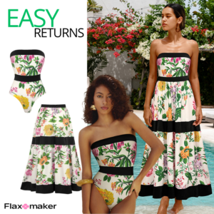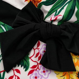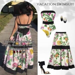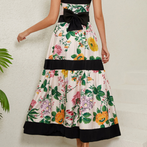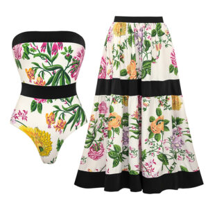 Off Shoulder Back Bow Tie Color Block Printed One Piece Swimsuit and Skirt Flaxmaker