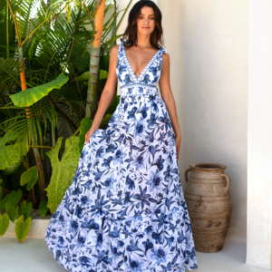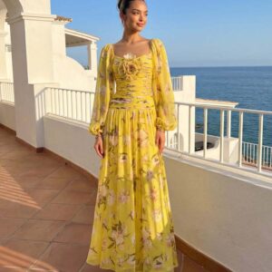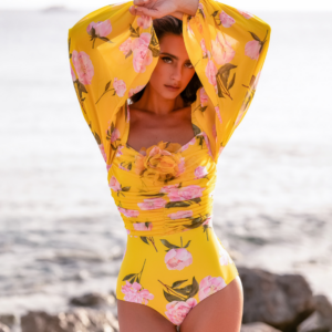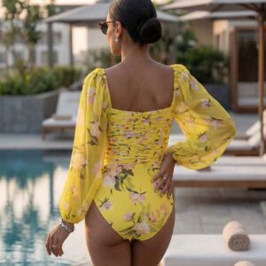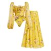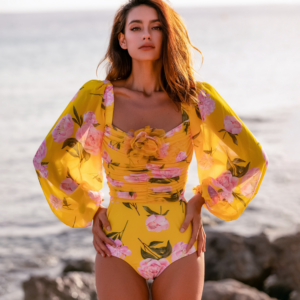 3D Flower Shirring Printed Chiffon Long Sleeves One Piece Swimsuit and Skirt