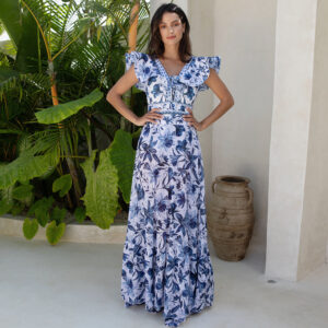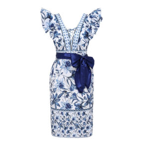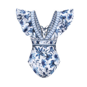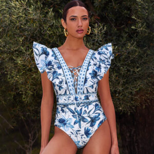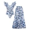 V Neck Ruffle Lace Up Printed One Piece Swimsuit and Skirt
