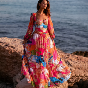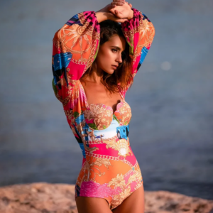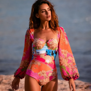 Long Sleeve Shell Chest Pad Printed One Piece Swimsuit and Skirt