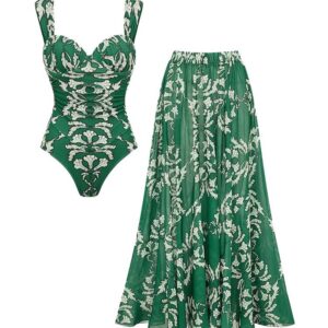Sling Underwired Shirring Printed One Piece Swimsuit and Skirt