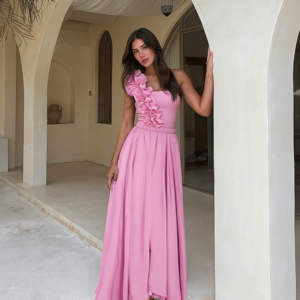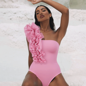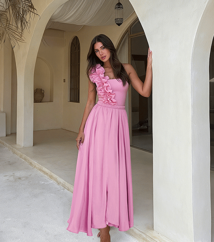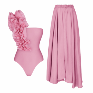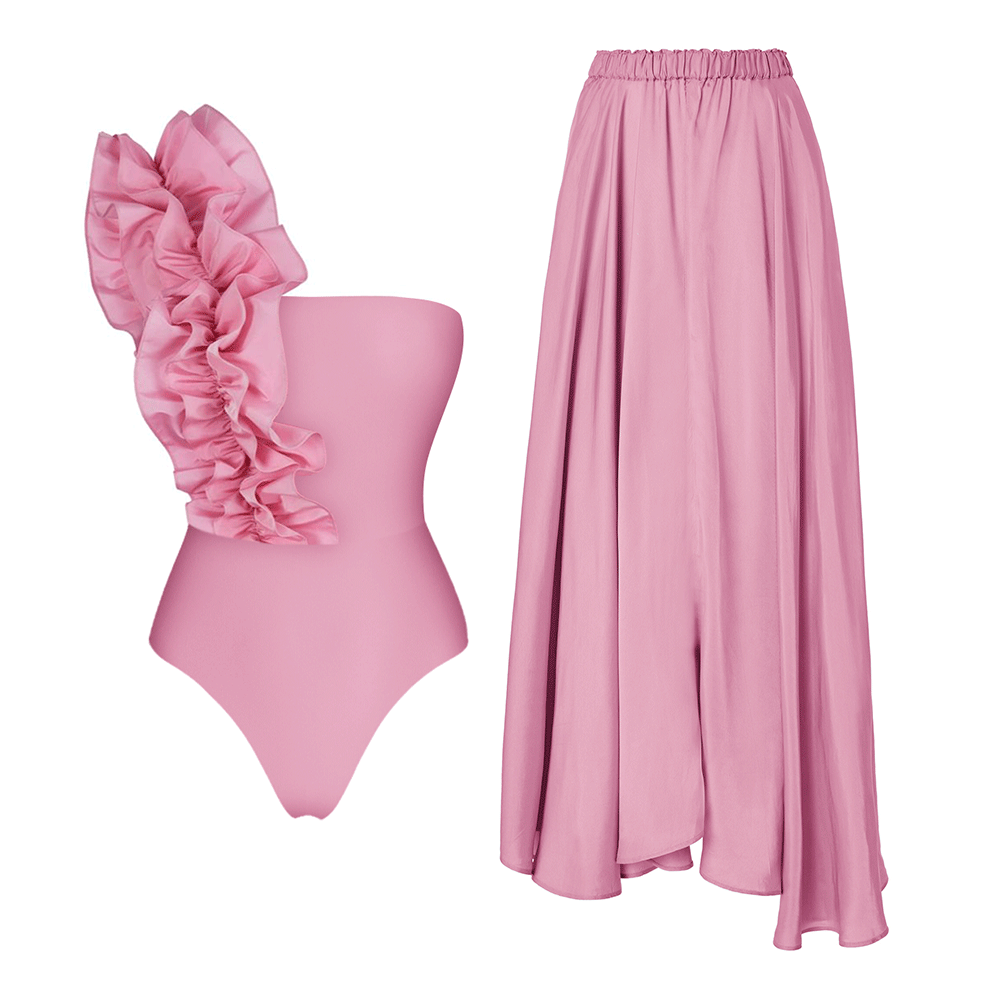 One Shoulder Ruffle Solid Color One Piece Swimsuit and Skirt