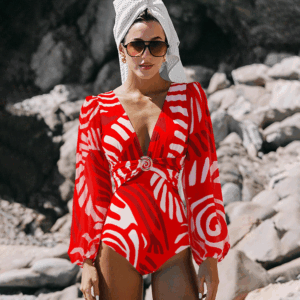 Long Sleeves Red Tribal Print Swimsuit Set(s)