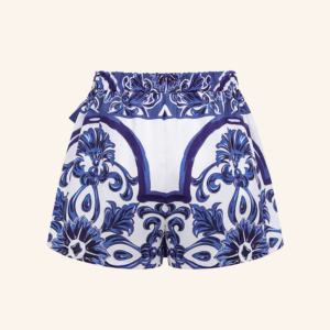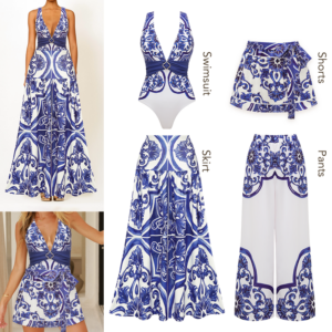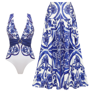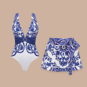 V Neck Classic Majolica Series Pattern Print One Piece Swimsuit and Pants or Shorts