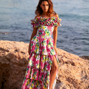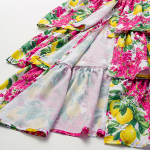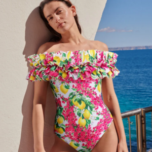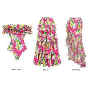 Bandeau Ruffled Lemon Floral Print One Piece Swimsuit and Mesh Splicing Sarong