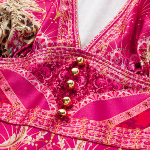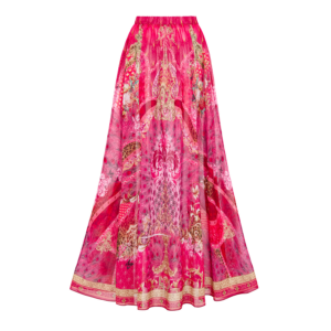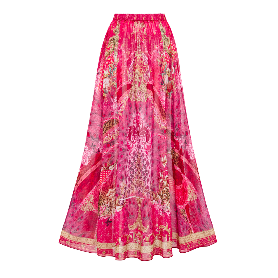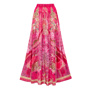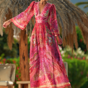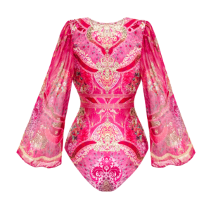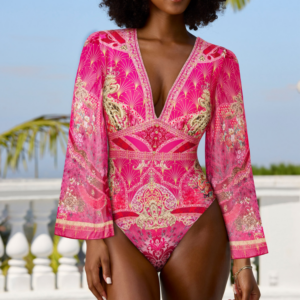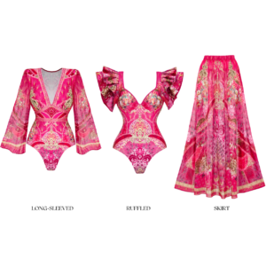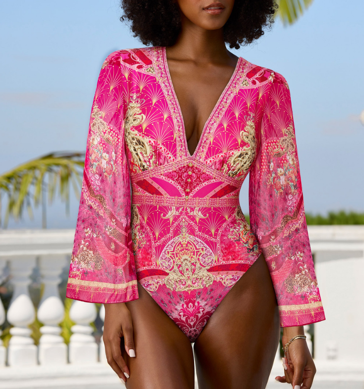 Long-sleeved Rose Red Blooming Flower Print One Piece Swimsuit and Skirt