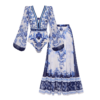 Blue Shiny Beaded Flowers Deep V-neck One Piece Swimsuit and Split Skirt