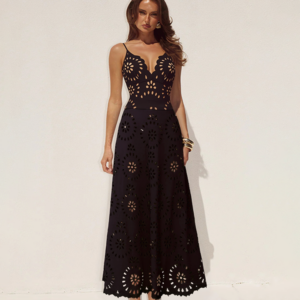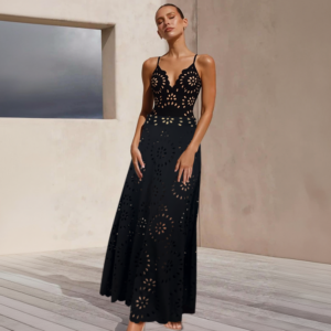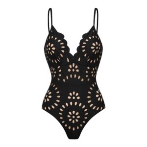 Black Laser Cutting Flower Hollow One Piece Swimsuit and Skirt