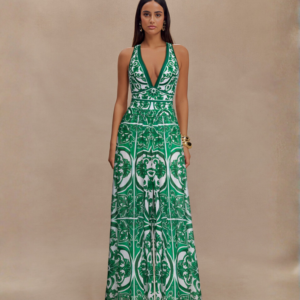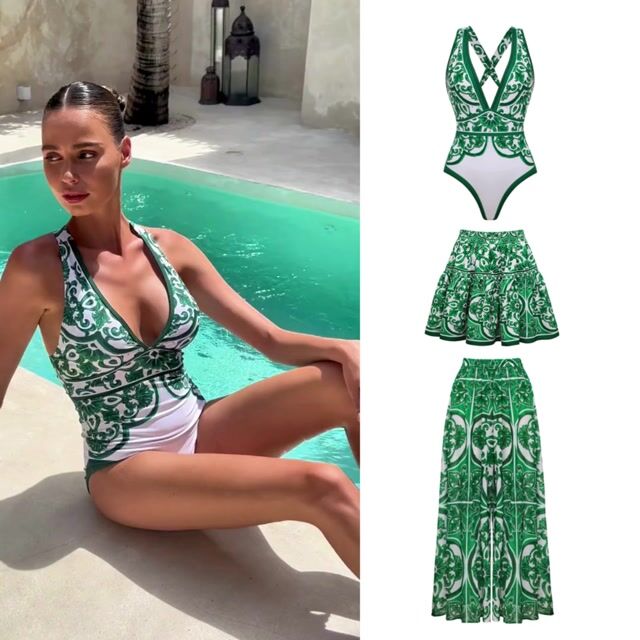 V Neck Classic Majolica Series Pattern Print One Piece Swimsuit and Pants or Skirt