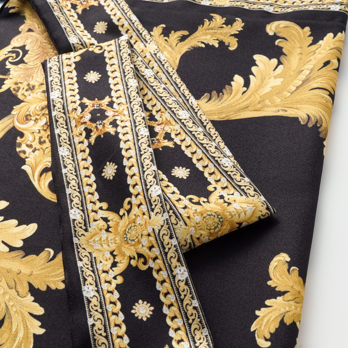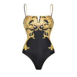 Vintage Black Gold Baroque Print Metal chain small V-neck One Piece Swimsuit and Skirt