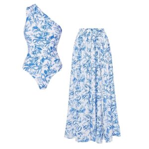 Oblique Shoulder 3D Flower Color Block One Piece Swimsuit And Skirt