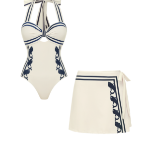 Navy Style Printed Bow Tie Decor One Piece Swimsuit and Skirt