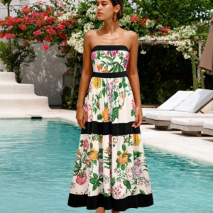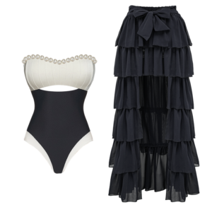 Off Shoulder Back Bow Tie Color Block Printed One Piece Swimsuit and Skirt Flaxmaker