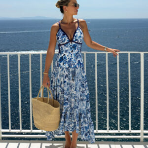 V Neck Blue Mediterranean Print One Piece Swimsuit and Mesh Splicing Skirt Flaxmaker