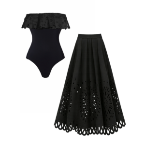 Black Laser Cutting Flower Hollow One Piece Swimsuit and Skirt